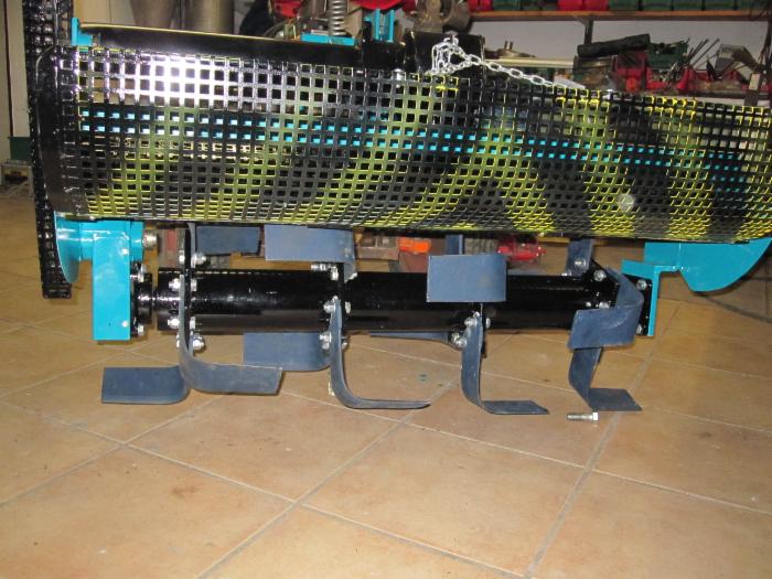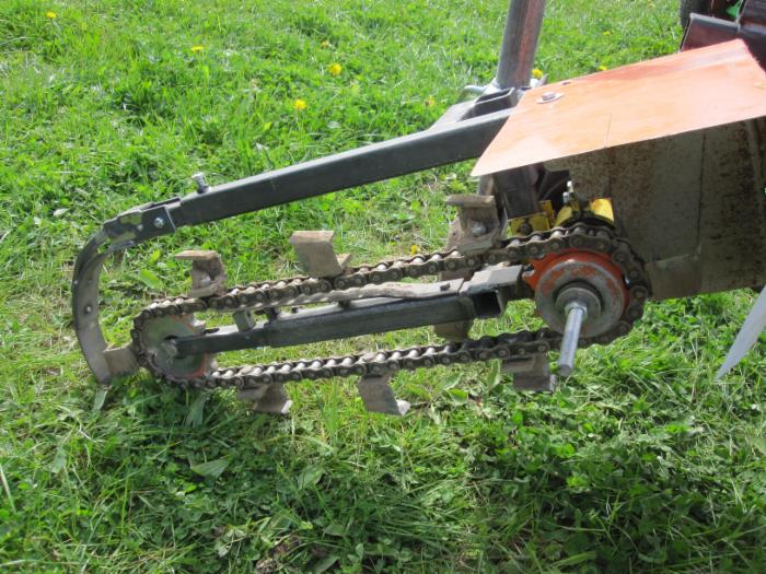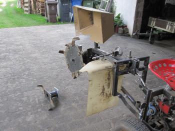 Fräse 1 Arbeitsbreite 98cm. Der Antrieb erfolgt hier mittig über ein Schneckenradgetriebe. Dieser Getriebeblock stört bei harten Boden, sodass die Fräse nicht tief genug arbeiten kann.