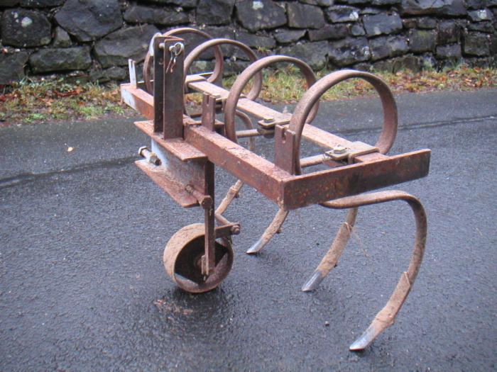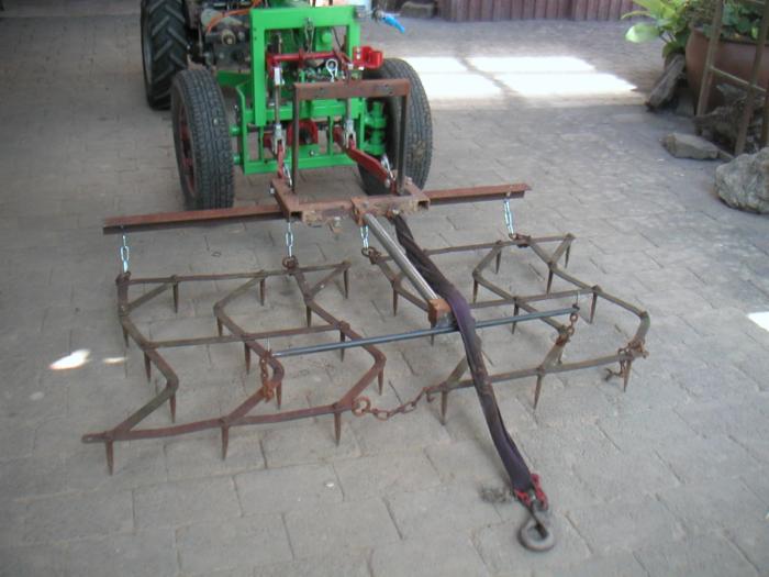Bei ganz langsamer Fahrt werden die Zinken durch Senken und Heben der Dreipunkthydraulik in den Boden gedrückt. Dadurch wird der Boden leicht angehoben und gelockert. Da der Boden hier sehr Steinreich ist, ist das eine der wenigen Möglichkeiten etwas Grassamen zum Auflaufen zu bekommen. Der Weg wird auch täglich befahren.