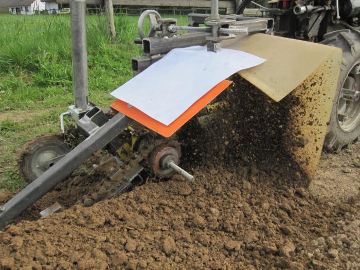 Handhacke bearbeiten kann. Der Untere Bereich des Kartoffeldamm wird beim
