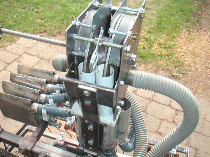 Nach einem Umbau von 4 auf 6 Reihen habe ich noch einen Pneumatischen Einzelkornverteiler gebaut. Das Vakuum wird mit einer Staubsaugerturbine erzeugt. Über 2 Lochscheiben werden die Körner auf zwei Säschare geleitet.