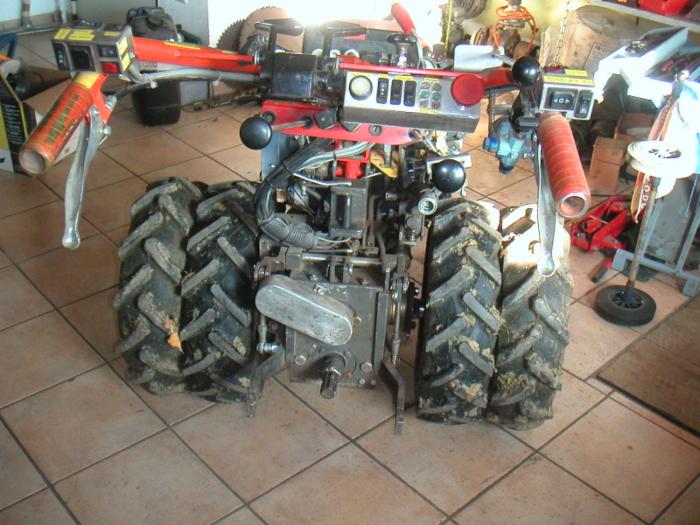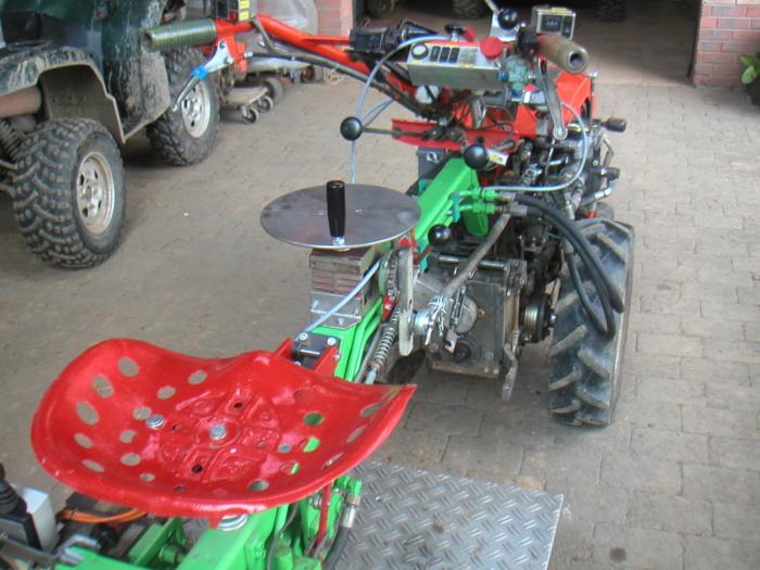 an Anbaugeräten, Links Mitte Wipptaster für stufenlos Vor und Zurück. Schalter für 2 unterschiedliche Beschleunigungsstufen, Hydraulik mit zuschaltbarer Pumpe, Doppeltwirkende Steckkupplungen für Anbaugeräte, Öltank ca. 7 Liter im Rahmen integriert, Gesamtgewicht 275 Kg. Reifen 4x12AS, Zwillingsbereifung.