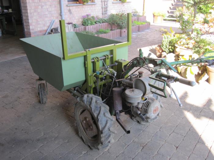 Transporter mit Hochentleerung. Trägerfahrzeug ist ein Vogel&Noot Jet 2 Frontmäher mit 2 Vor und 2 Rückwärtsgängen. Das Fahrzeug hat Radkupplungen und Lenkbremsen zum rangieren. Der Motor ist ein MAG mit 6 PS. Die Hydraulikpumpe wird über die Klauenkupplung im Mähwerksanschluss angetrieben. Die Mulde kann man auch komplett abkuppeln, und dort den Doppelmesserbalken anbauen.