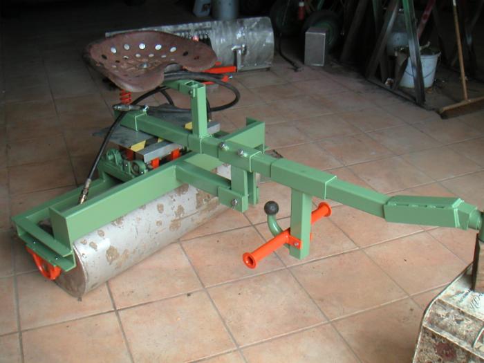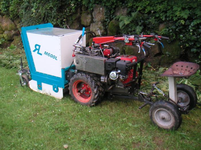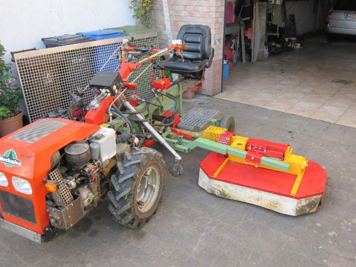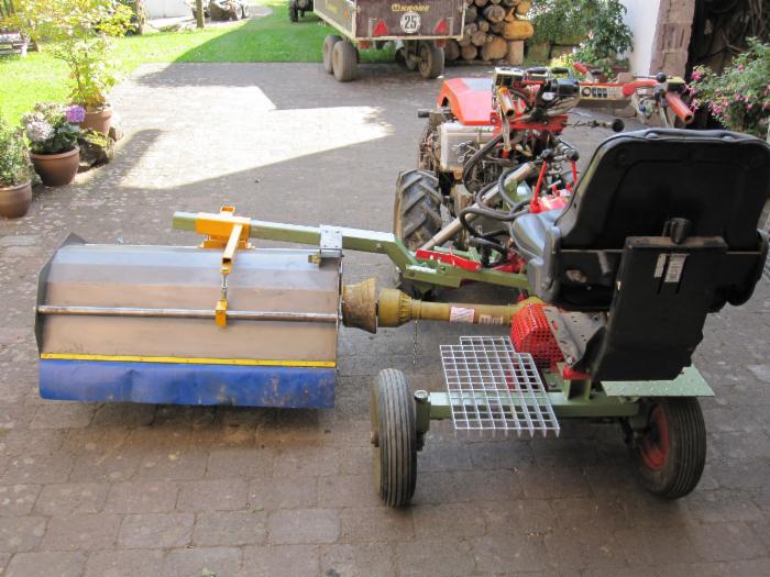 Kreiselmäher an Nachläufer mit mechanischer Hecklenkung über Gebergestänge. Mähwerk und Entlastungsgewichte hydraulisch klappbar. An dem Nachläufer können auch weitere Geräte angebaut werden.Arbeitsbreite 100cm.