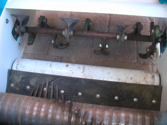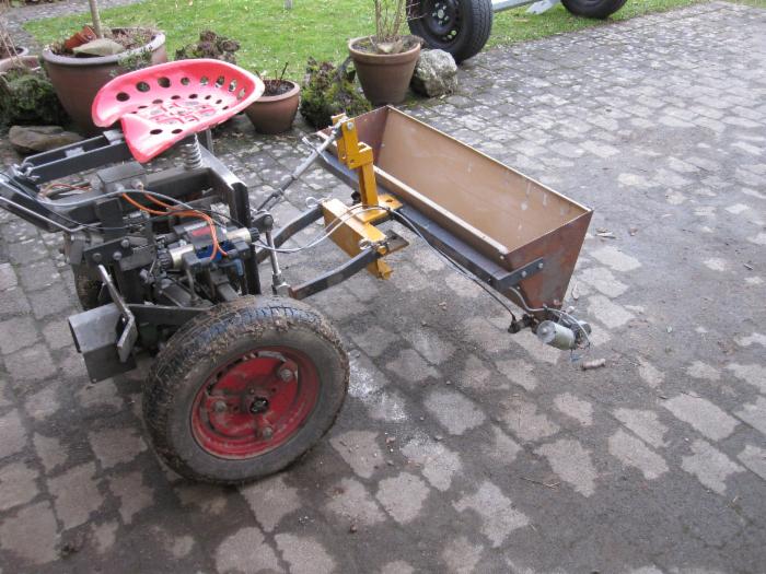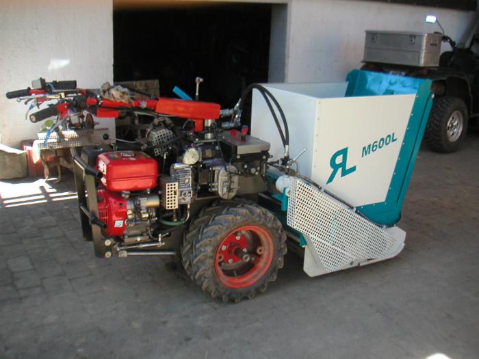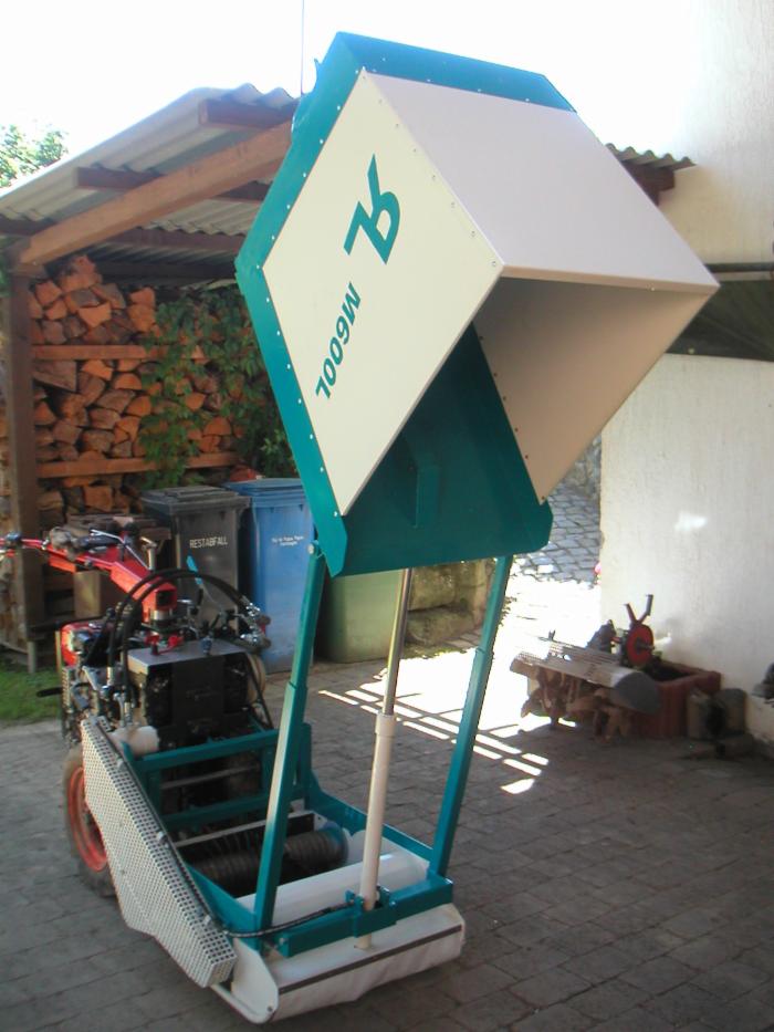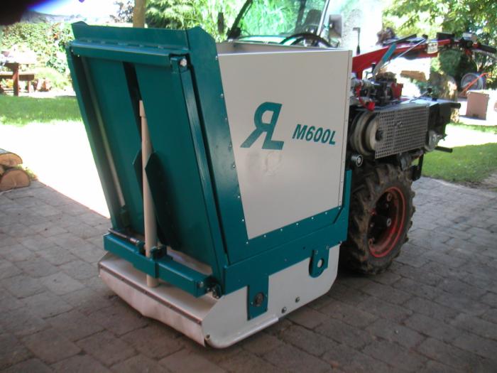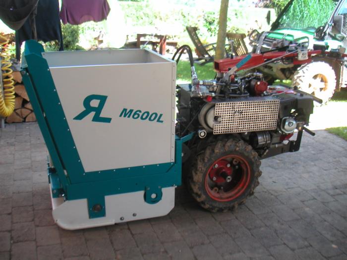 60cm Arbeitsbreite. Linke Seite alles bündig gebaut um nah an Hindernissen vorbeizufahren. Mulcherwelle über mehrere Keilriemen angetrieben. Laderotor wird hydraulisch angetrieben. Über Dreiwegehahn wird die Hebe- und Kippfunktion des Laderaums betätigt.